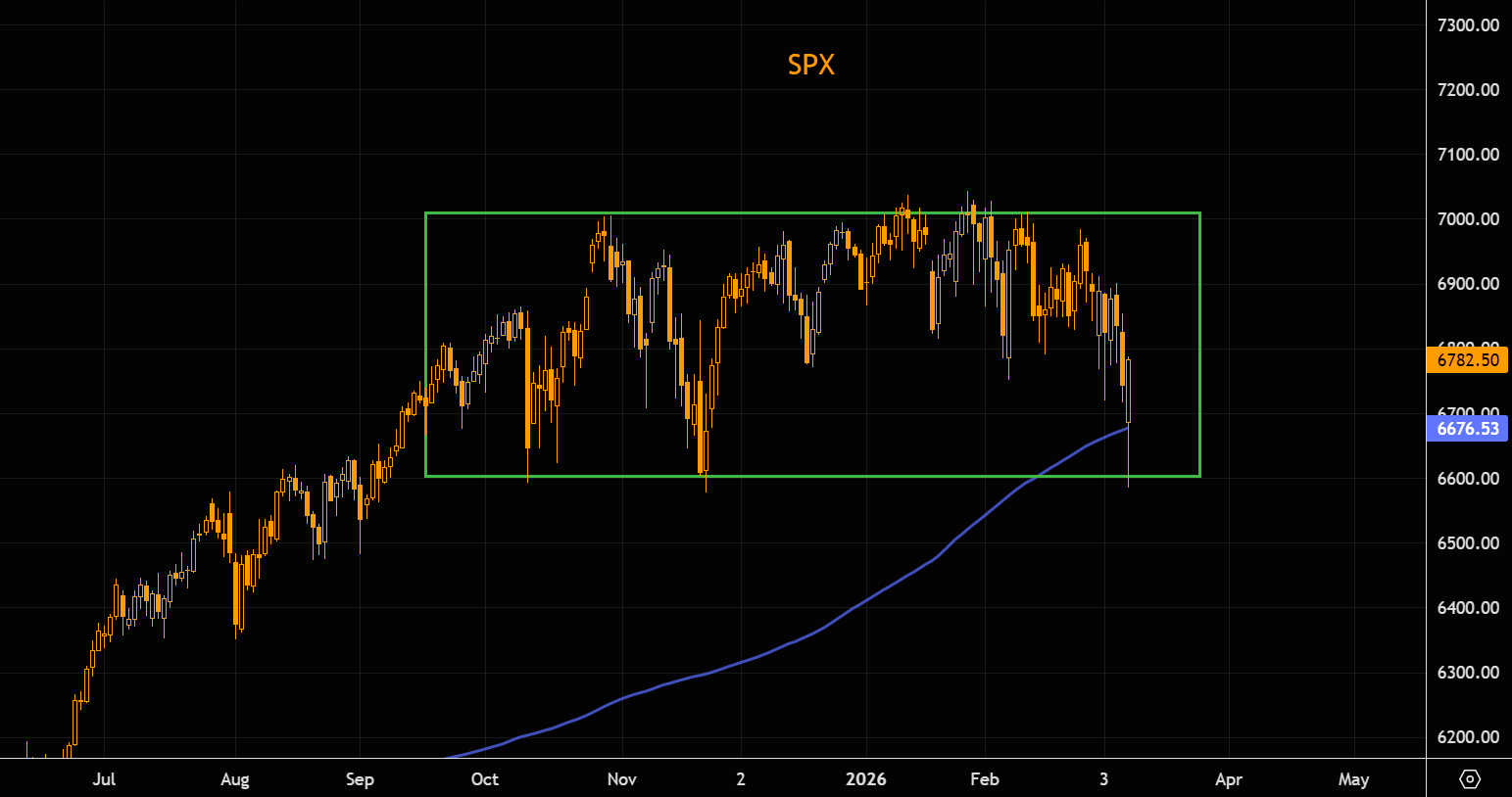 Quick update on the range logic we flagged earlier today when markets were deep in the red. SPX has printed a massive hammer candle, with intraday lows right at range support. The index is now well above the 200-day MA again. Headline risks remain large both ways, but for now the eternal range holds.