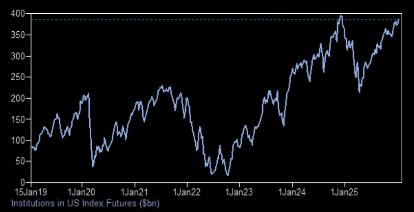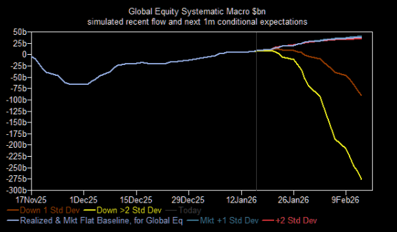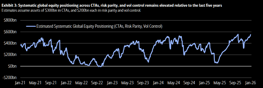 BofA on the CTA crowd coming into this week: CTAs with medium- to long-term trend signals remain heavily stretched long across U.S., European, and Japanese equities. With realized equity volatility at depressed levels, vol-sensitive strategies have likely pushed aggregate systematic exposure to its highest level in roughly five years. The risk profile is asymmetric: downside moves could trigger material CTA unwinds, while flat to higher markets would likely see only gradual adjustments. Their models suggest CTA selling would begin after declines of roughly 3% in the S&P 500 and Nasdaq, 5% in the Russell 2000, 3.5% in the EURO STOXX 50, and 6% in the Nikkei.