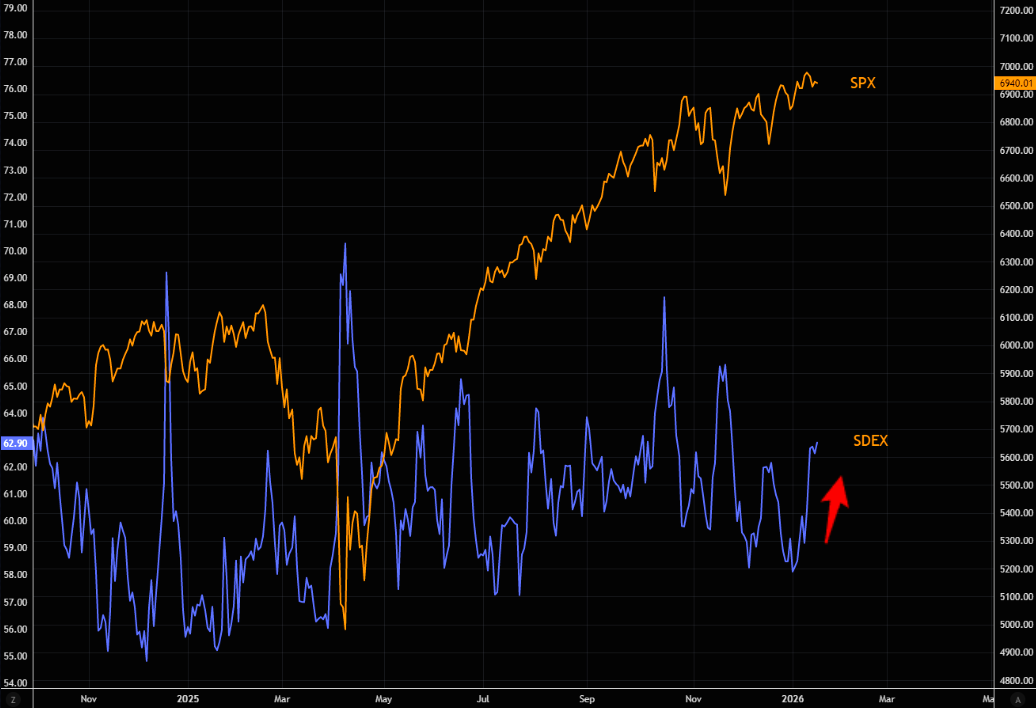 We have been pointing out the relatively aggressive bid in downside protection over the past week. Note SDEX closed out the week at the highest levels in a while. That is before the move lower in futures today, so plotting SPX index vs SDEX.