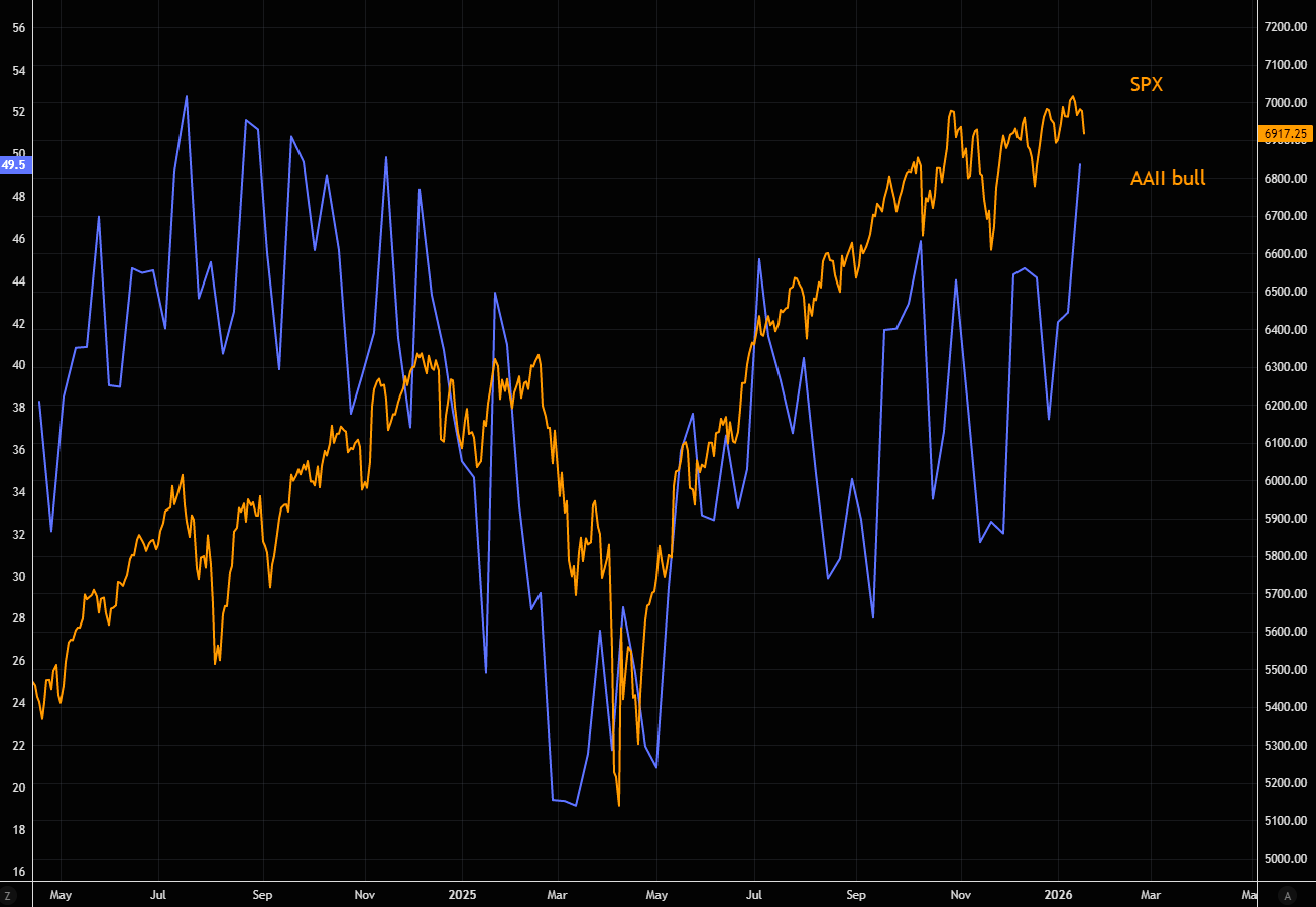 It would be perfect if SPX pulled back a few percent, just as AAII bulls hit their highest levels since autumn 2024.