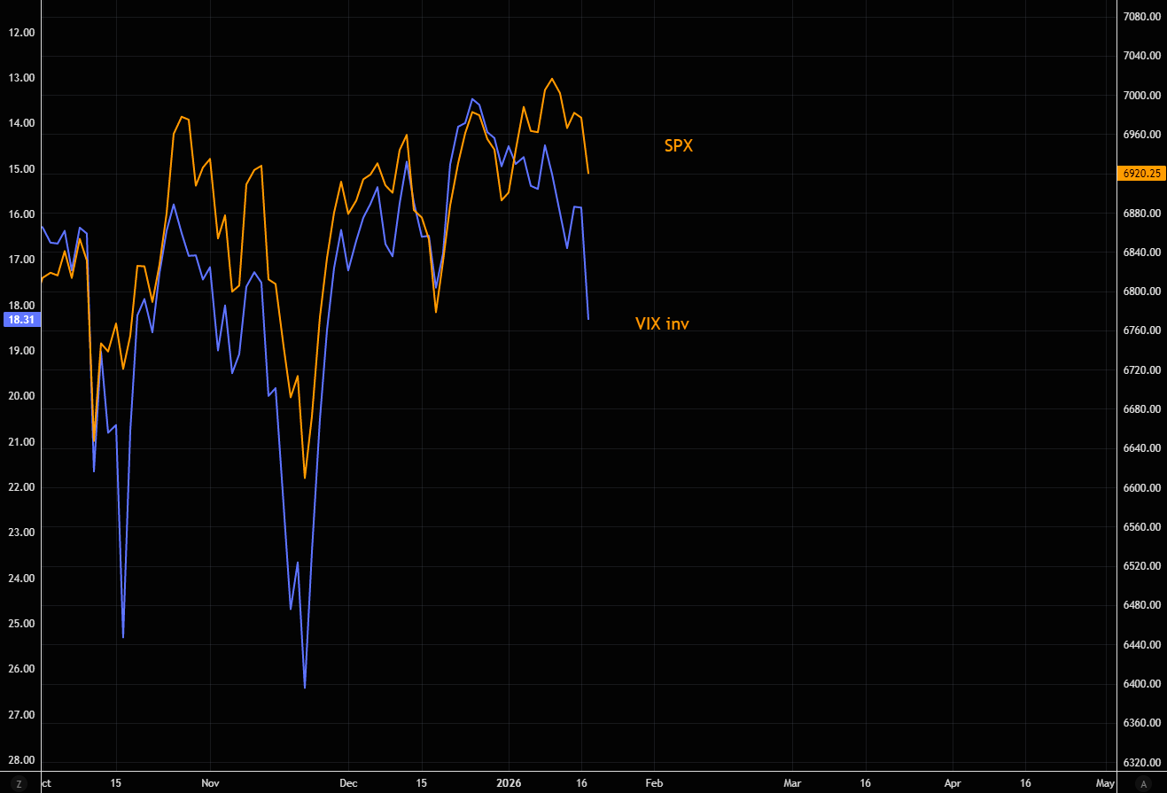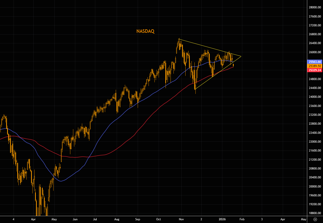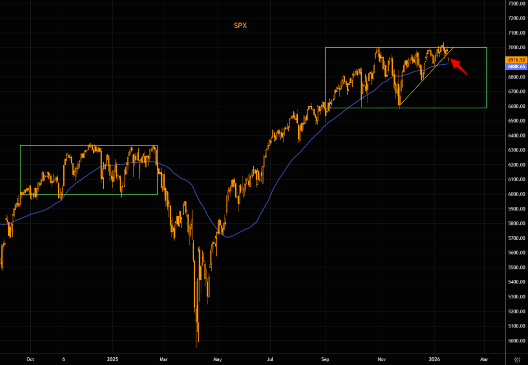 SPX has once again reversed in the upper part of the range. Price is now breaking below the short-term trendline, with the 50-day MA sitting just beneath. A decisive close below that level risks accelerating downside momentum. For us, the déjà vu from early 2025 remains very much intact.