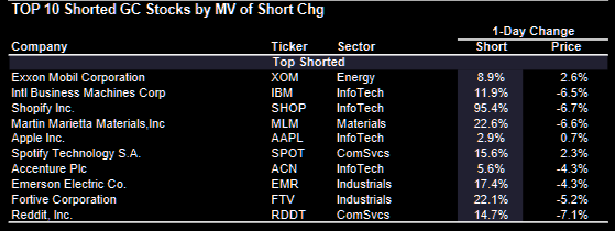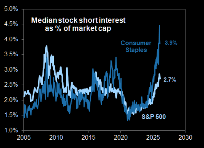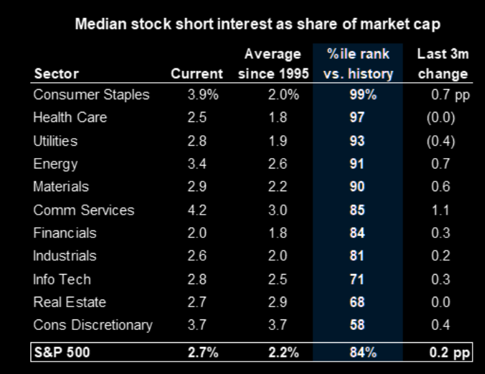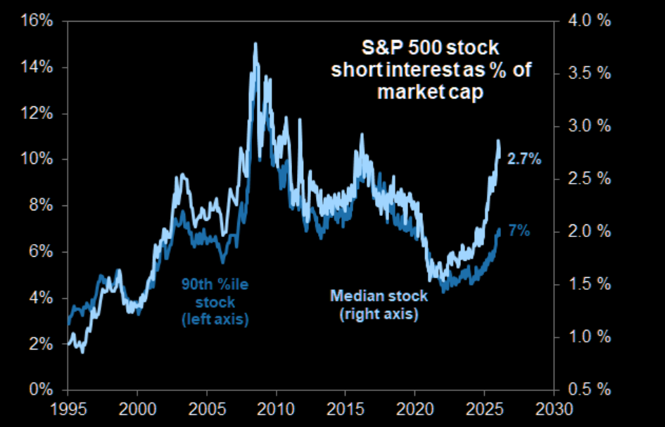 Short interest is at very elevated levels. The median S&P 500 stock carries short interest equivalent to 2.7% of market cap, which ranks in the 84th percentile since 1995 and the 97th percentile relative to the last five years.