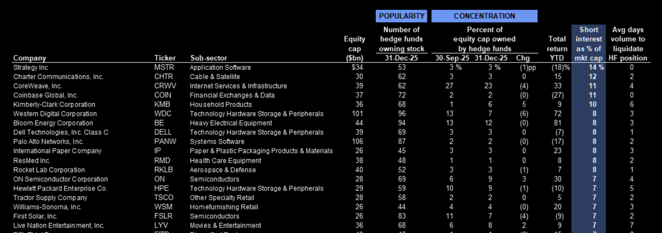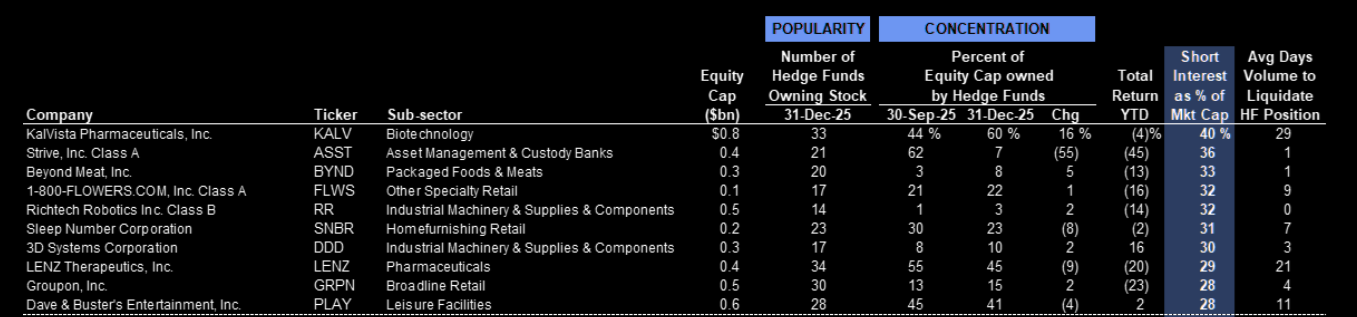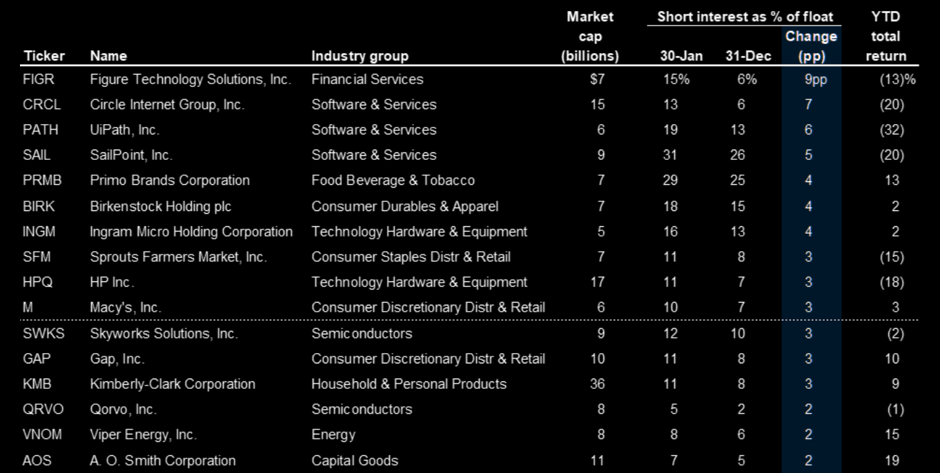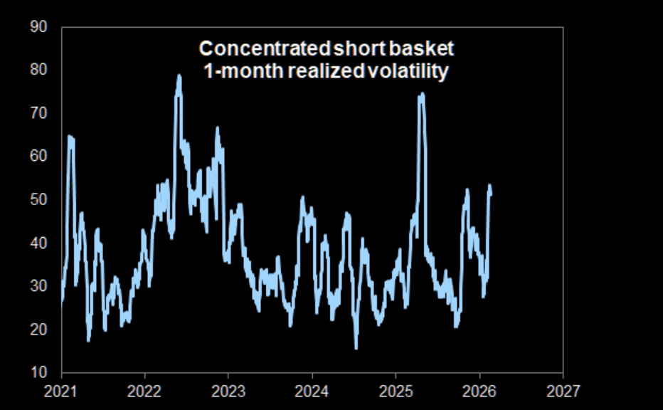 Realized volatility in the most concentrated short positions has recently spiked. A basket of the most concentrated short positions squeezed higher by more than 20% during the first three weeks of the year, and the basket's recent volatility has registered the highest level since last year's tariff shock.