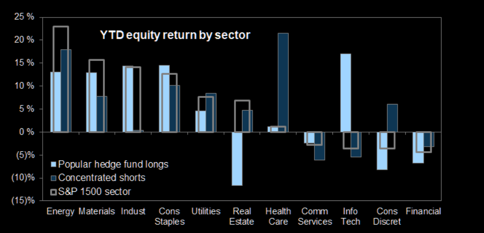 The recent short squeeze has affected nearly every sector. The most concentrated short positions have outperformed popular longs in 6 of 11 sectors YTD. Concentrated shorts have declined outright YTD in Communication Services, Info Tech, and Financials.