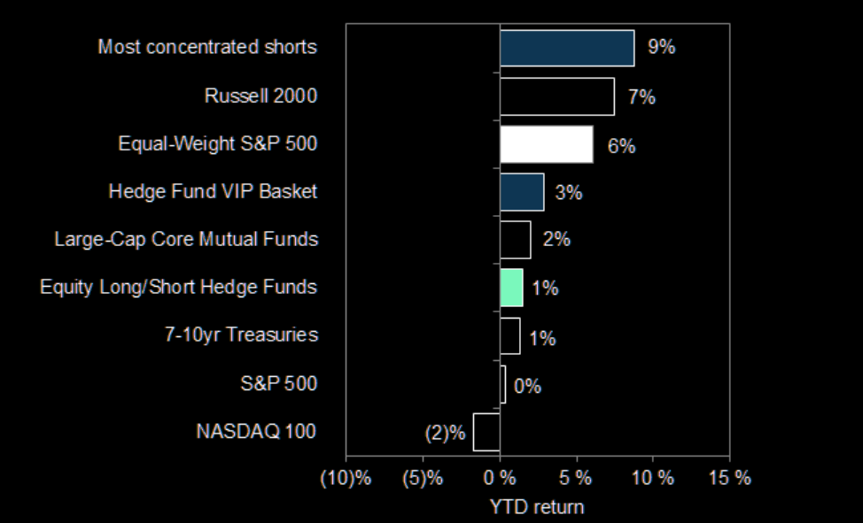 The Hedge Fund VIP basket of the most popular hedge fund long positions has returned +3% YTD, compared with +9% for a basket of stocks with the most concentrated short interest.