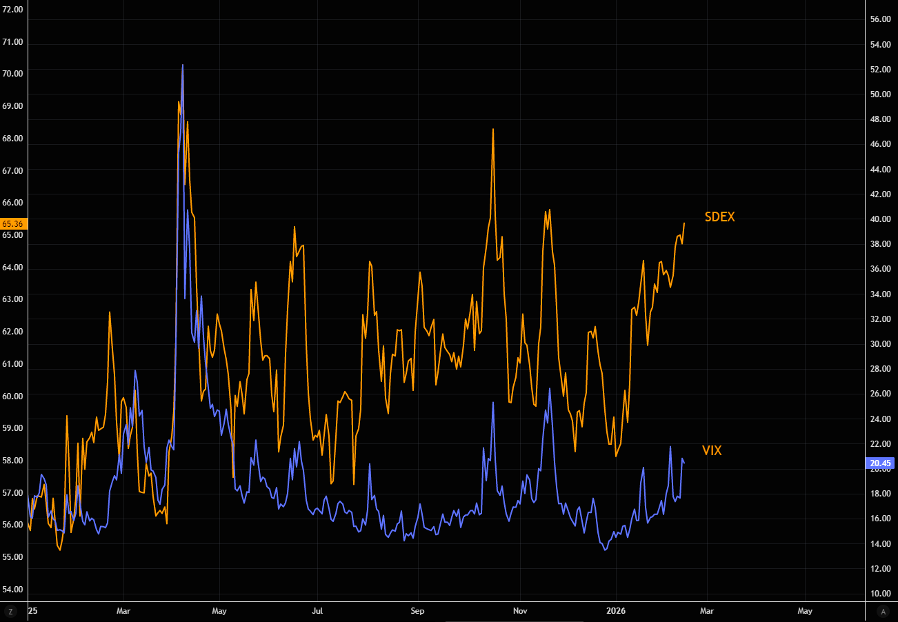 With VVIX at 113, the market is still pricing elevated fear. The VVIX–VIX gap remains wide.