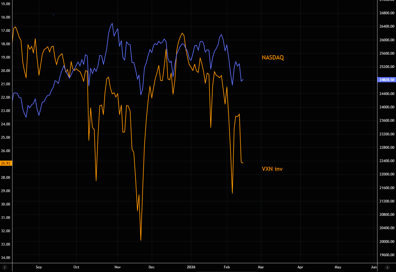 NDX volatility is hovering near recent “panic” levels, even as the index is relatively flat and we head into a long weekend (expensive theta). Chart shows NDX vs VXN (inverted).