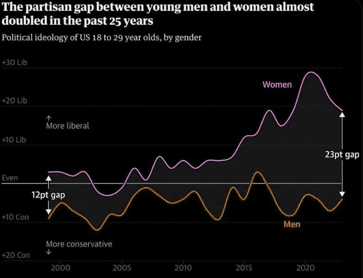 Young men have stayed similarly conservative for 25 years, while young women have turned left.