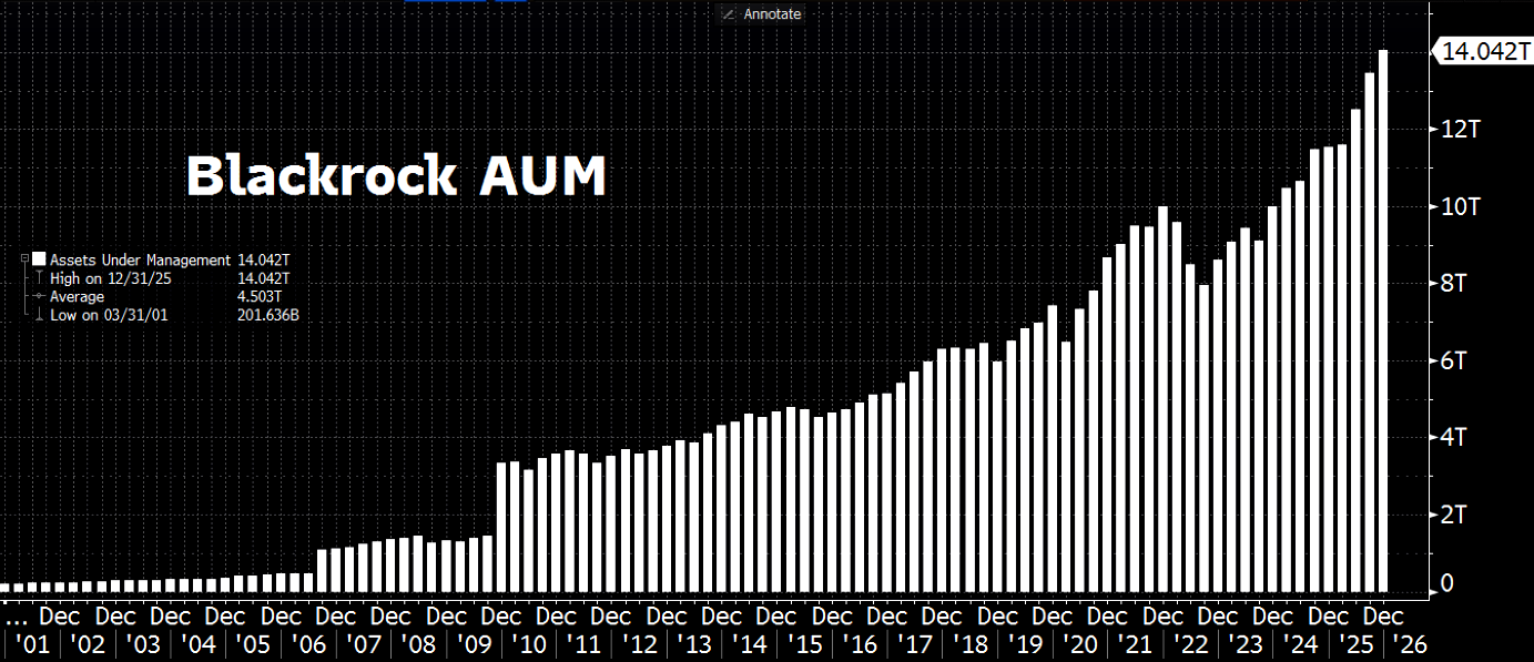 Total assets under management hit a record $14 TRILLION after the firm pulled in $342bn of client money in Q4 alone.