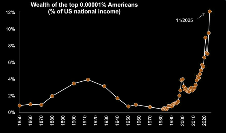 At the peak of the Gilded Age in 1910, the richest 0.00001% of the US population owned wealth equal to 4% of national income. Now, the richest 0.00001% owns 12%. US billionaire oligarchs today are even wealthier than the original robber barons.