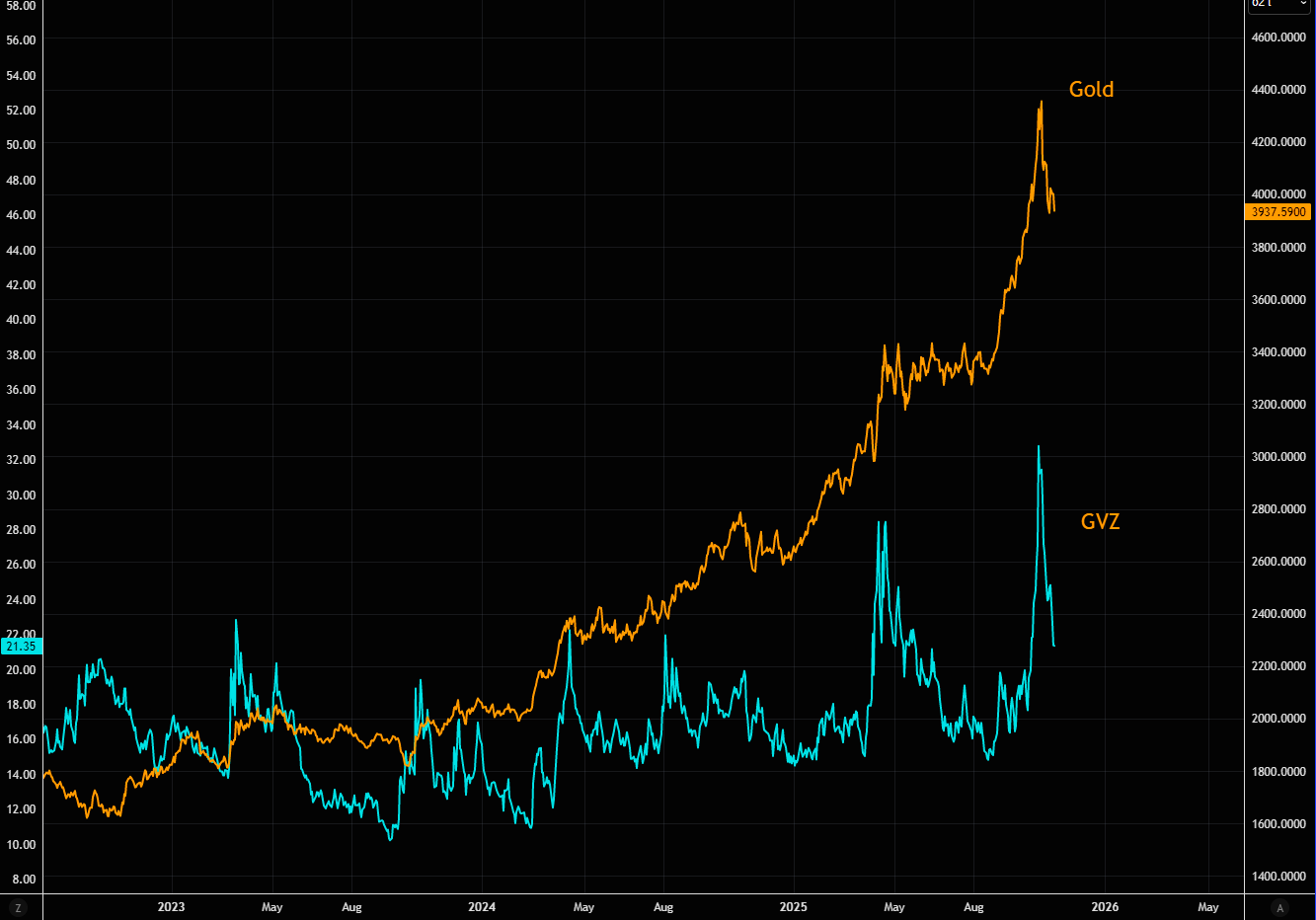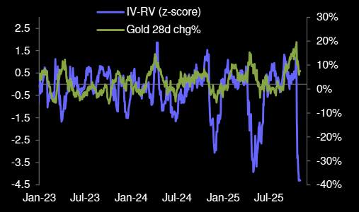 Implied volatility trading well below realized volatility. This makes it problematic for investors to manage gold positions.