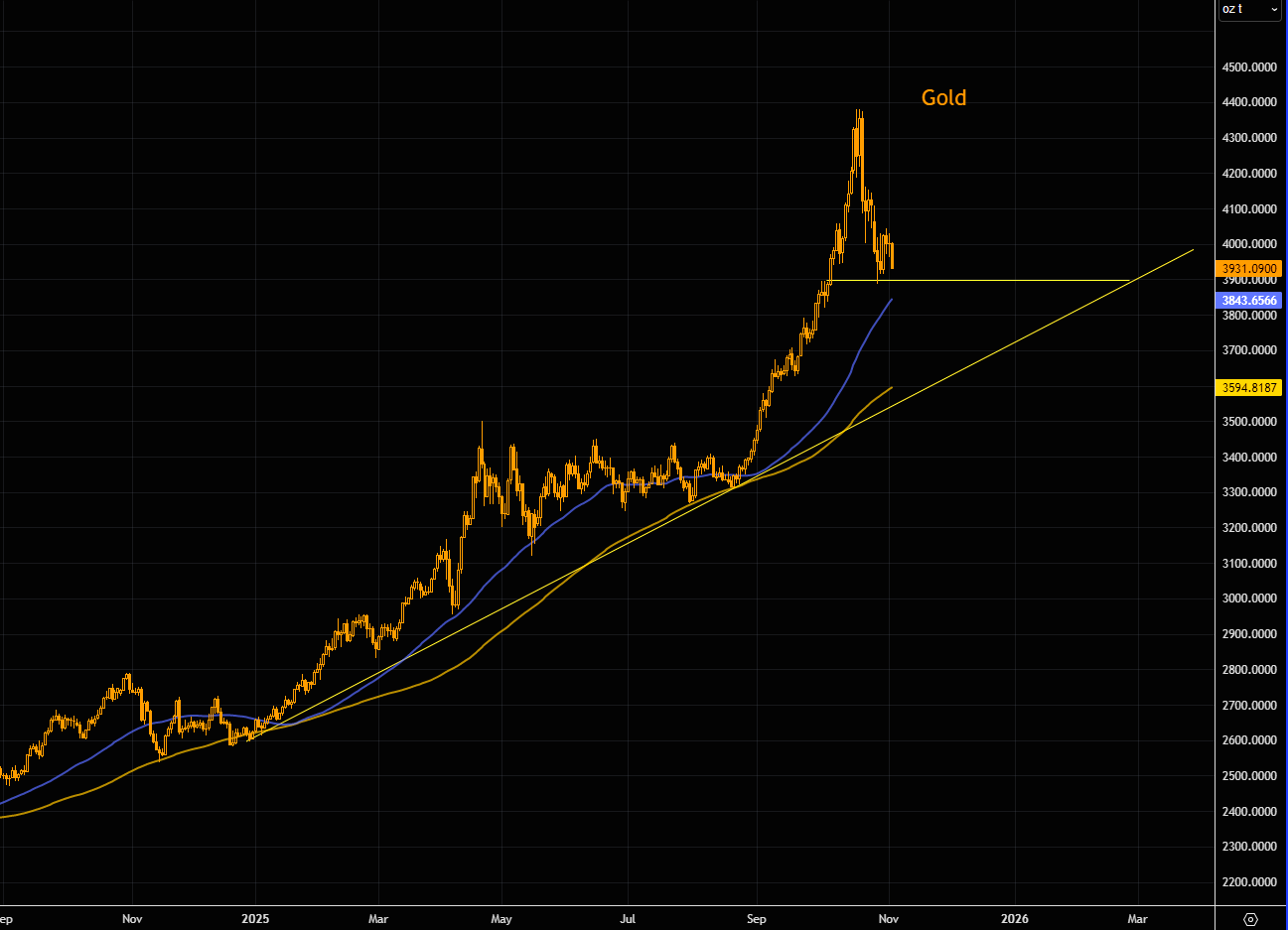 Gold putting in another big down candle. $3900 is the line in sand level to watch (50 day comes in slightly lower). A close below that area and things could accelerate further to the downside. 100 day and the longer term trend line comes in around the $3600 area.