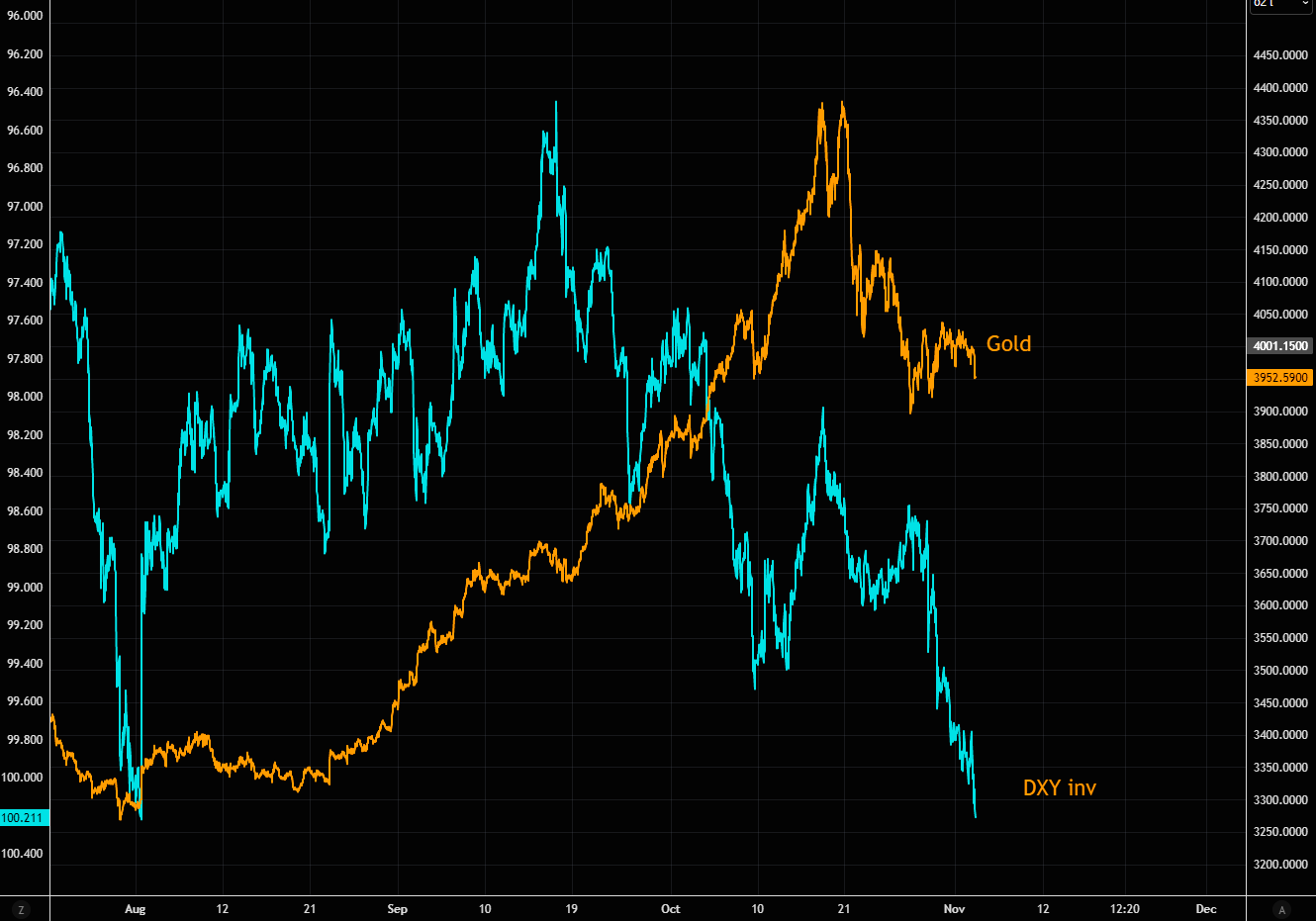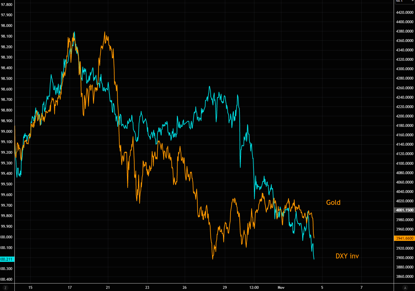 Gold has moved in close tandem with the dollar over the past weeks. Chart 2 shows that the last time the dollar traded here, gold was around $3400.