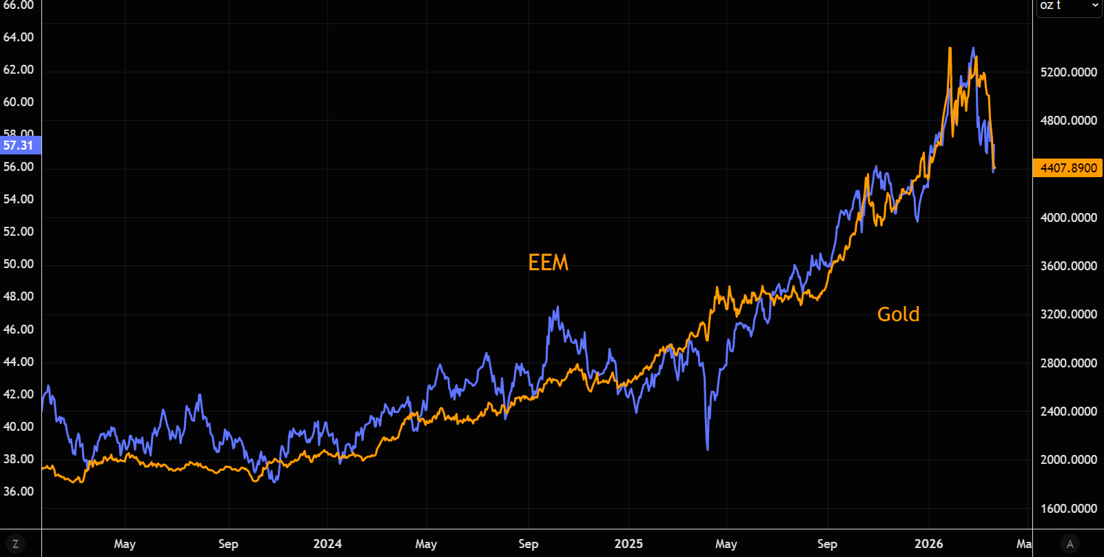 Relative to EM equities, gold actually looks slightly cheap at current levels.