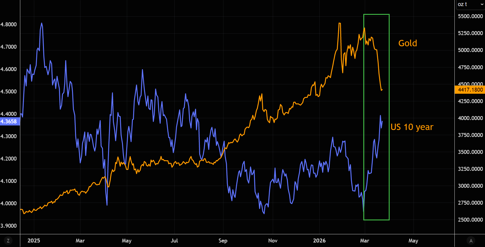 Gold just tagged the 200-day and printed a textbook hammer, but rates are ripping and gold is trading like a risk asset, tracking the inverted US 10 year and EM equities, while flows turn negative and puts flip to a premium.