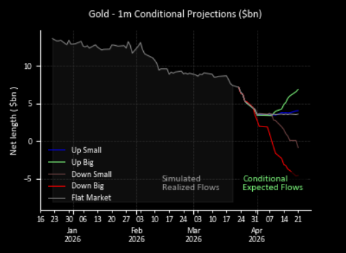 Current net length near median; "Up Big" shows upside potential (green line), "Down Big" implies big downside risk (red line). CTA positioning is no longer as stretched → room to move both ways.