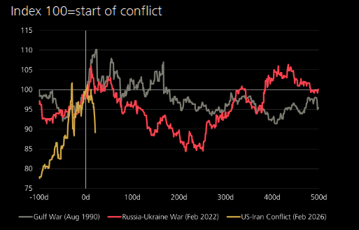 The chart shows gold’s performance during phase 1 of conflicts, and it’s not particularly impressive, despite ongoing fear-hedge selling narratives.