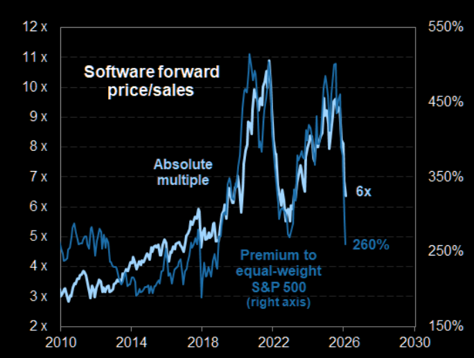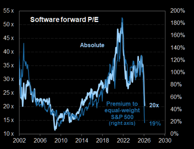 Goldman comparing software to newspaper stocks that fell 95% in the internet era is about as bearish as it gets. Markets have seen this movie before: when analysts flirt with “zero” outcomes, real positioning is washed out and real expectations have already collapsed. More often than not, that’s when contrarians start paying attention. The only thing that stops us from starting to buy is that we kind of agree with the comparison - the fundamental outlook truly is awful.