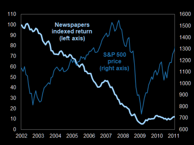 GS: "Historical episodes of major disruption risk suggest that share price stabilization will require stability in the earnings outlook. The multi-year decline of newspaper stocks ended only as earnings estimates bottomed
