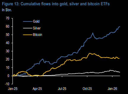 Retail embraced the “debasement trade” in early 2025 via bitcoin and gold ETFs, but flows diverged after July. Bitcoin ETF inflows stalled and turned negative in Q4, while gold ended the year near $60bn in cumulative inflows, with silver seeing most of its buying in Q4, pointing to a retail shift from bitcoin toward precious metals since August. (JPM)