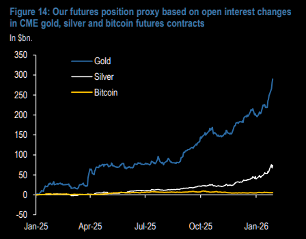 Institutional futures positioning has surged in silver since late last year, with gold showing a similar accumulation trend over the past year. By contrast, bitcoin futures positioning has remained largely flat, underscoring a clear institutional shift toward precious metals.