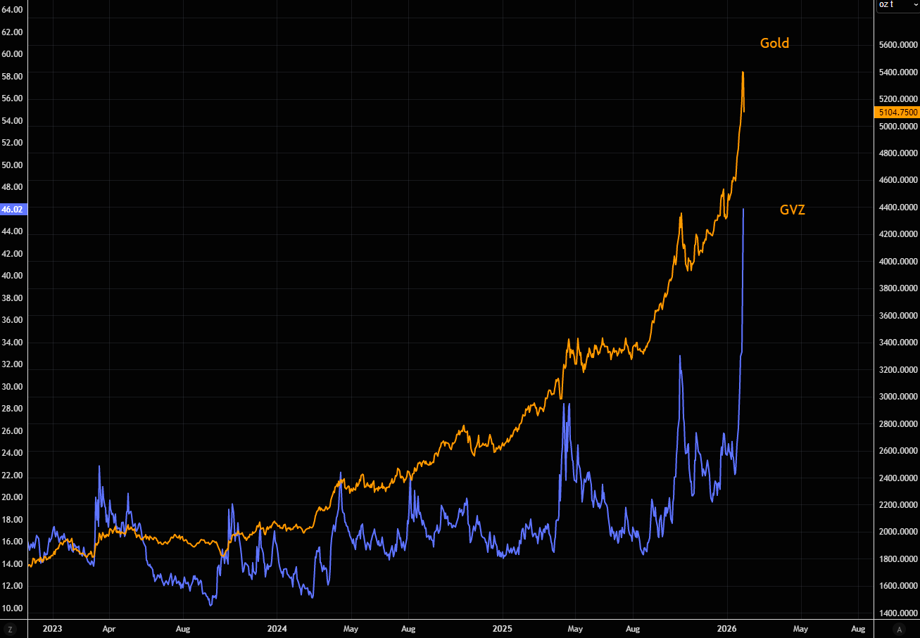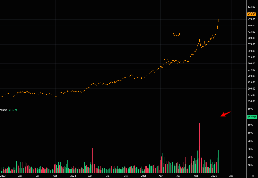 GLD volumes have gone from heavy to outright extreme. This isn’t what a healthy, sustainable market looks like. It has all the hallmarks of late-stage chasing, with a lot of participants pulled into longs they don’t really understand, and likely won’t have the relevant risk management in place when this starts to wobble in a more extreme fashion.
