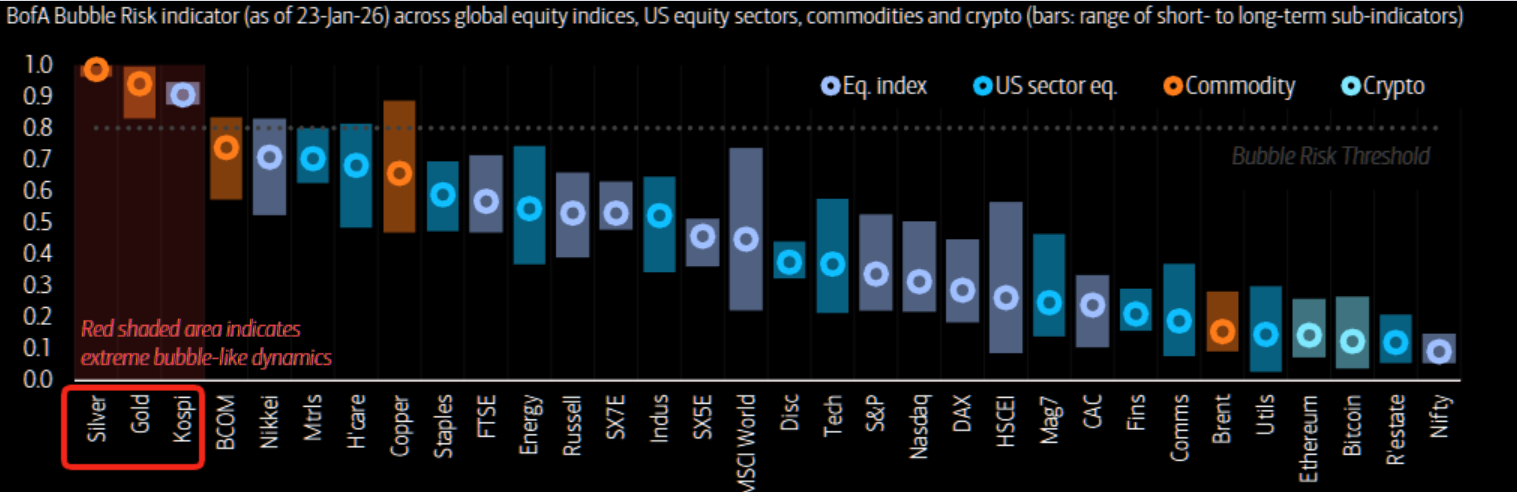 BofA absolutely nailed this one: Bubble Risk indicator shows gold (silver and KOSPI as well) in bubble territory... "pushed its Bubble Risk Indicator (BRI) to extreme readings above 0.9, historically a cautionary level that motivates watching for near-term downside risks and leveraging the asymmetry of options".