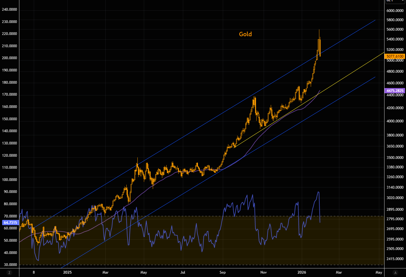 Gold about to re-enter the huge trend channel. Even a ~$500 pullback would only take us back to the rising trend line that’s been in place since September (yellow), roughly aligned with the 50-day MA. Momentum has already cooled fast: RSI dropped from 91 to 65 in just 24 hours. For context, the late-October reset didn’t bottom until RSI was closer to 50, right before gold started catching bids again. Note this is a log chart.