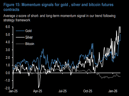 Momentum signal, often used as a proxy for CTA-style positioning, show silver as heavily overbought, suggesting momentum traders have been a major driver of its recent rally. Gold futures also look very overbought, while bitcoin futures are oversold, increasing the near-term risk of profit-taking or mean reversion in gold and silver.