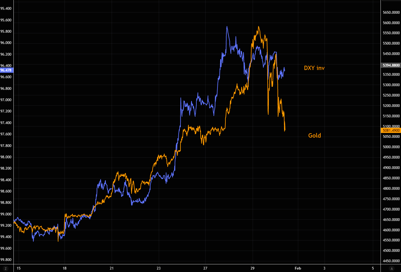 Short term gap between gold and DXY (inverted) getting rather wide. Let's see how this plays out, but a lot of new money started chasing gold because of the latest DXY move....and seems they didn't count on Warsh.