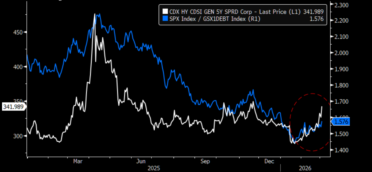 "We like going short our basket of high yield sensitive equities: GSXUDEBT, given high yield credit spreads are expected to widen in-line with GS forecasts. The GSXUDEBT basket is composed of CCC-rated issuers and non-rated companies with similar fundamentals (negative free cash flow and high debt ratios)."