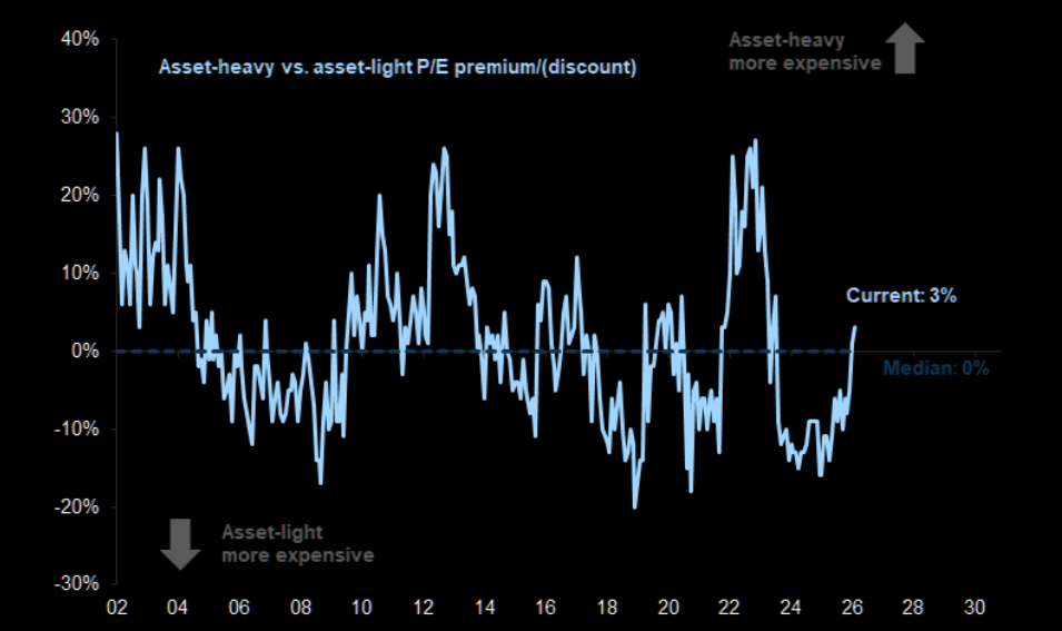 US Asset-heavy stocks now trade at a P/E premium to asset-light stocks.