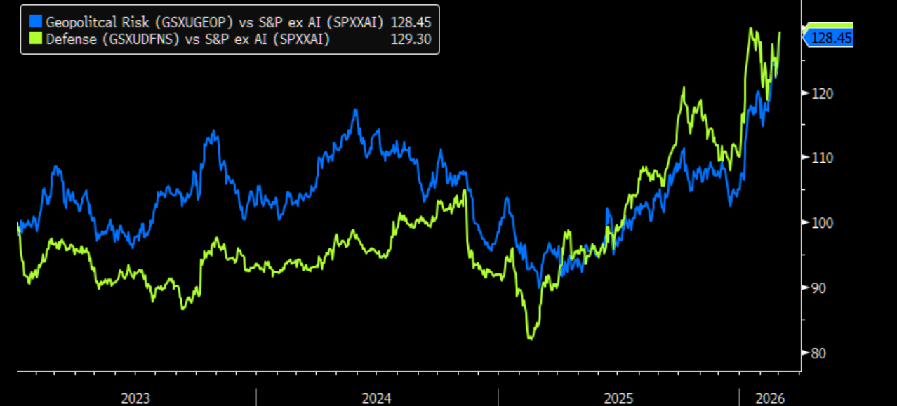 "Our Geopolitical basket (GSXUGEOP) is composed of defense (GSXUDFNS), oil producers, and oil tankers. Relative to the S&P excluding AI (SPXXAI), the basket is up ~23% YTD driven by both the defense and oil exposed names."
