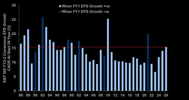 Outside of recovery years, consensus EPS growth expectations for the next 2 years are the highest they have been at this time of the year in 15 years.