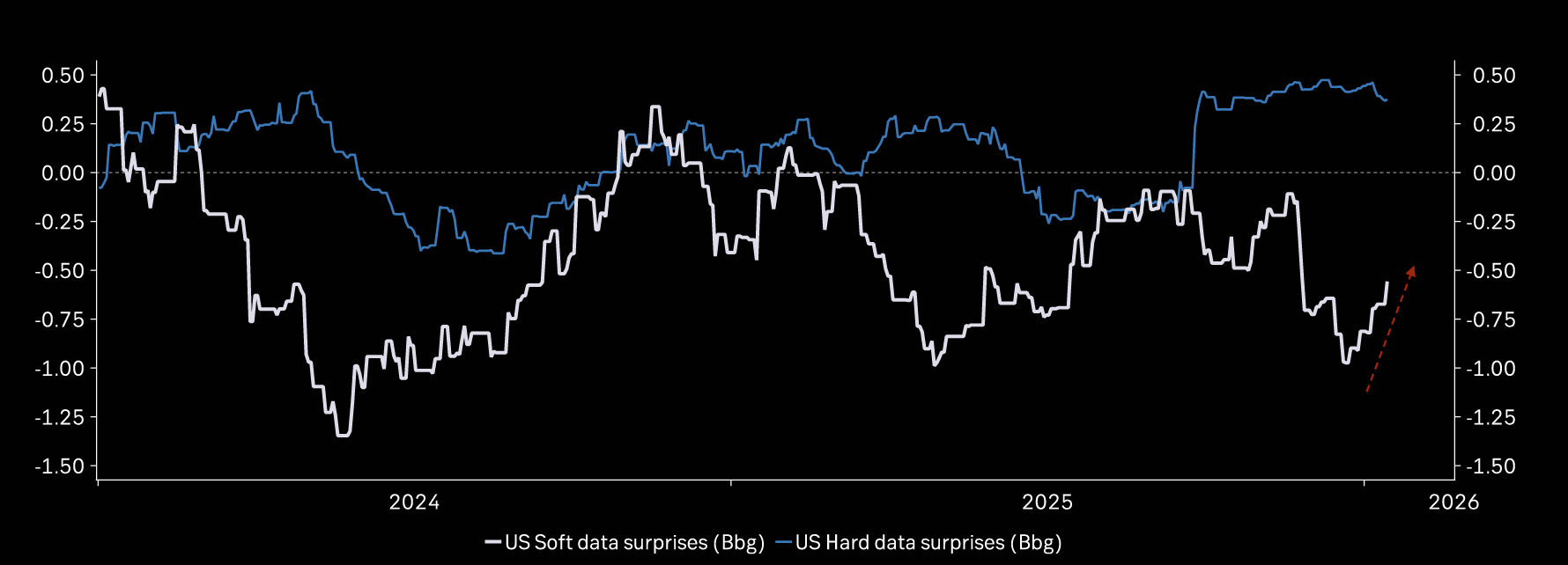 Soft indicator surprises have started improving while hard data surprises remain positive.
