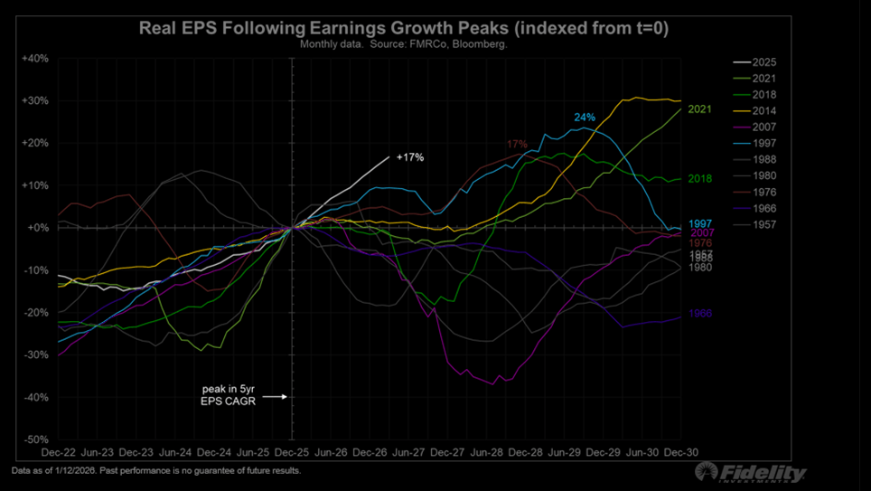 "Peak earnings growth and peak earnings are not always the same thing. Current estimates, suggest earnings could continue to advance higher by 17% over the next 5 quarters. If true, that will be the strongest continuation of earnings growth following a peak ever. Only the 1997 growth peak comes close." (Fidelity)