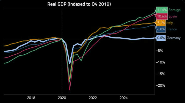 Germany has had no growth for years. It stayed flat only due to inflating its government spending while industry imploded.
