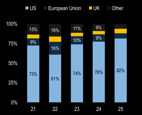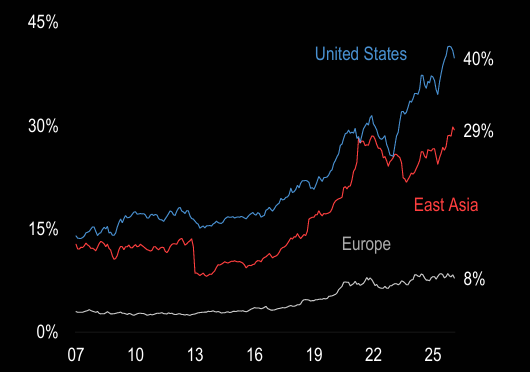 Tech stocks make up less than 10% of market cap in Europe. This is much lower than for the US and East Asia, and only slightly higher than the rest of the world (around 6%).