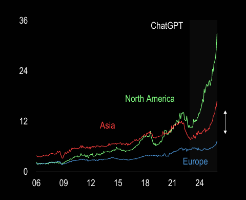 Chart shows Semiconductor sales / industrial production. Sales of integrated circuits historically follow the industrial cycle. AI infrastructure spending, however, has allowed for a surge in demand well above broad manufacturing applications - and Europe is of course doing what it does best - lagging.