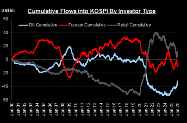 Korea’s chart looks almost too good: straight lines up, AI everywhere, buybacks surging, there is even a copper angle, and foreign flows still not crowded. Valuations aren’t crazy. Earnings are accelerating. This is usually the moment markets start whispering “bubble", right before the hardest part: deciding whether to fade it… or ride it.