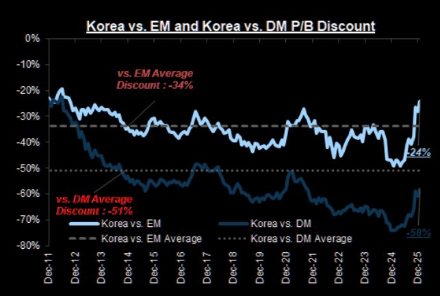 Despite the re-rating in 2025, Korean market still trades at a wide discount relative to EM and DM markets.