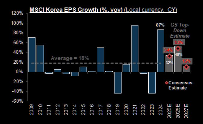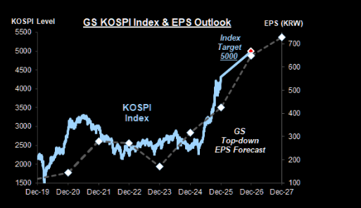 Goldman: "We expect another year of strong gains for Korean equities following a stellar 2025 performance. We forecast a 23% 12m USD total return in 2026, driven by above-consensus earnings growth amid a favorable macro backdrop and attractive themes. A supportive global macro environment, constructive fundamentals in Korean tech, industrial opportunities arising from geopolitical realignment, and continued corporate governance reform."