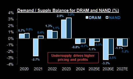 Hyperscaler capex is driving increases in semiconductor demand leading to large DRAM and NAND undersupply, in turn driving higher prices and operating profits in the semiconductor industry.