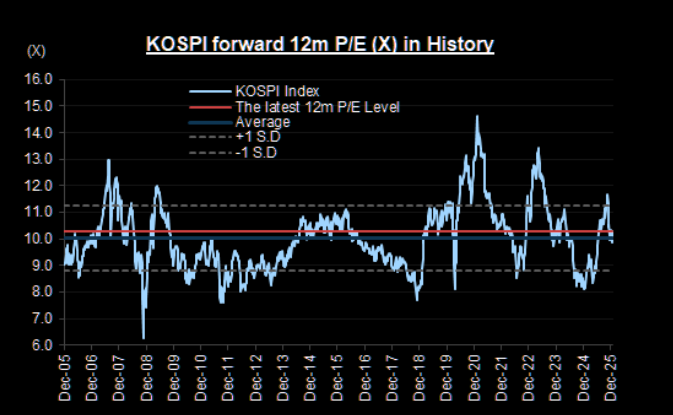 Considering strong earnings revisions, KOSPI NTM P/E also remains around historical average.