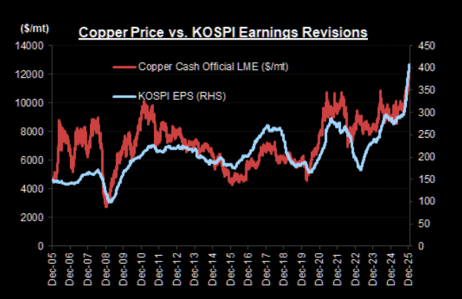 Copper prices and KOSPI earnings have exhibited a highly positive correlation sharing global macro cycles.