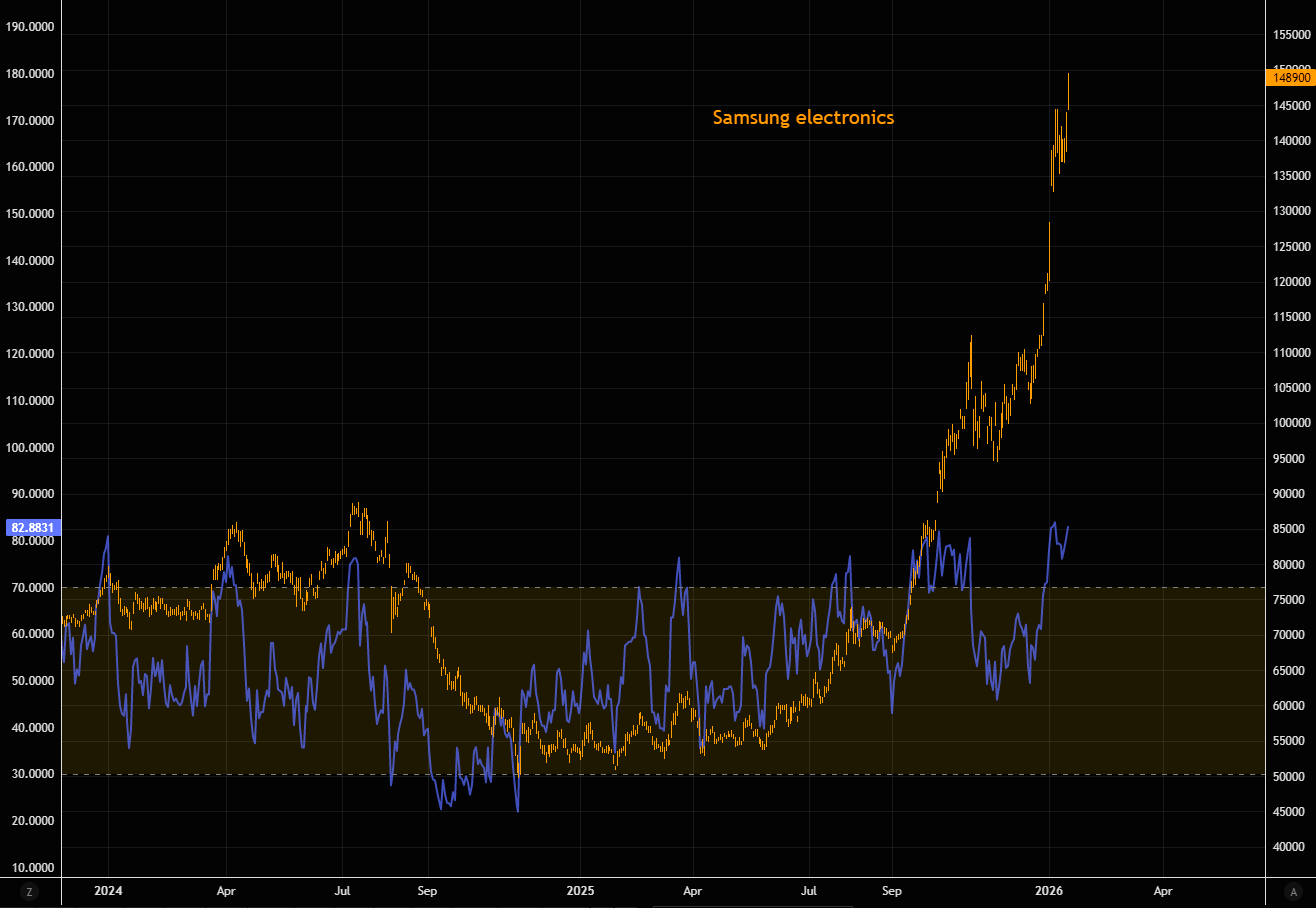 This is what happens when you add explosive squeeze to a bubble. Samsung electronics, massive AI play, has exploded to the upside lately. This is extremely overbought with RSI trading around the highest levels since 2021 actually.