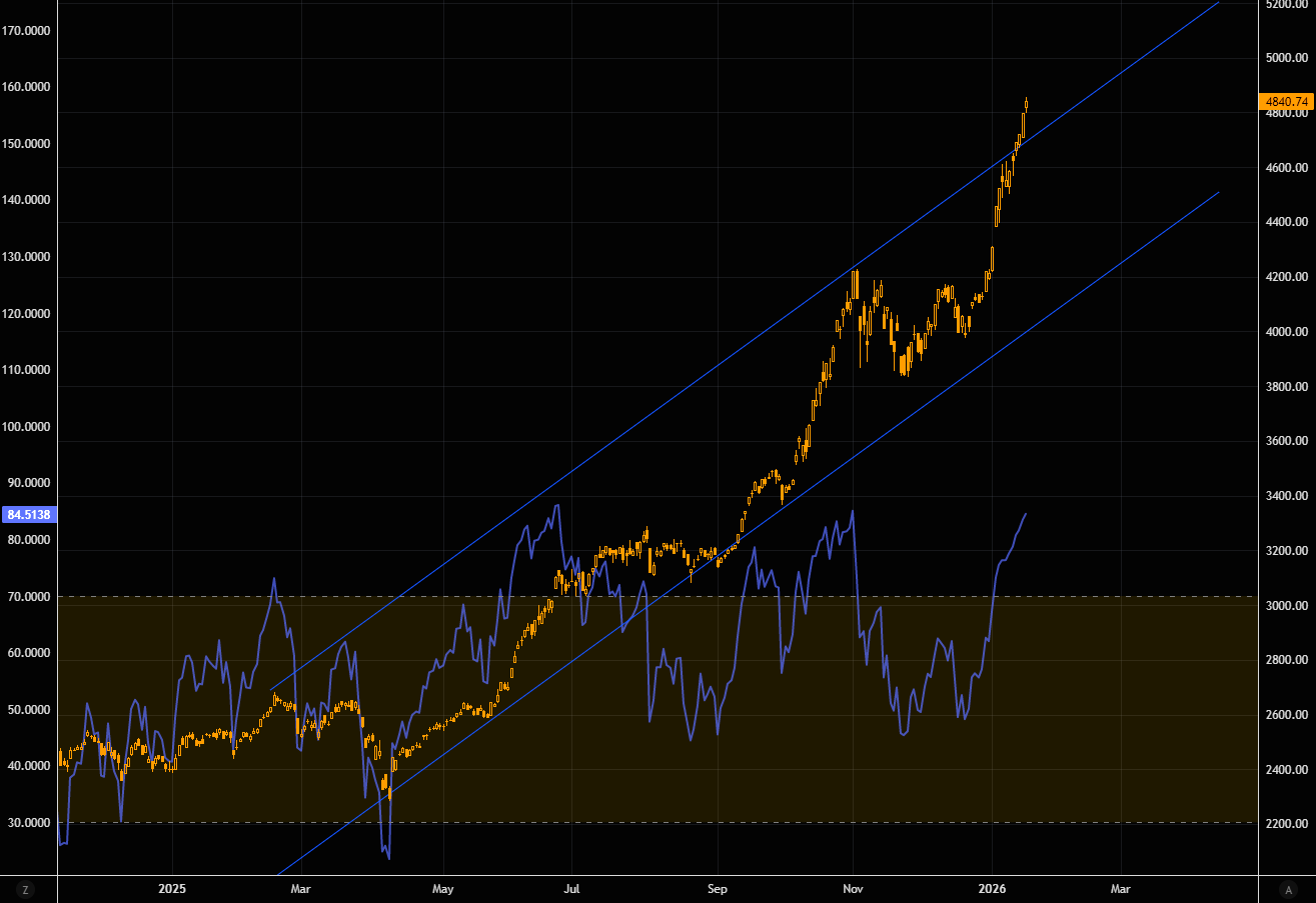 The king of index performance last year has started the year with another bang. Note we are now overshooting the trend chanel, and RSI is at recent peak levels, trading around 85.