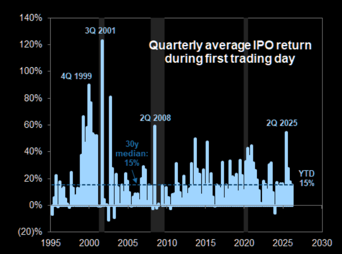 The average 2026 IPO has jumped by 15% on the first trading day, in line with the 30-year average. In addition, strong initial returns for recent IPOs have been short lived, with IPOs launched since the start of last year generating below-average returns during the subsequent few weeks and months.