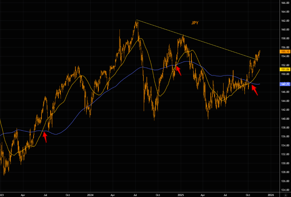 JPY broke above the big negative trend line a few sessions ago. The golden cross is in place (think inverse for the JPY as it gets weaker). The cross doesn't always work, but when it works it tends to go for it.