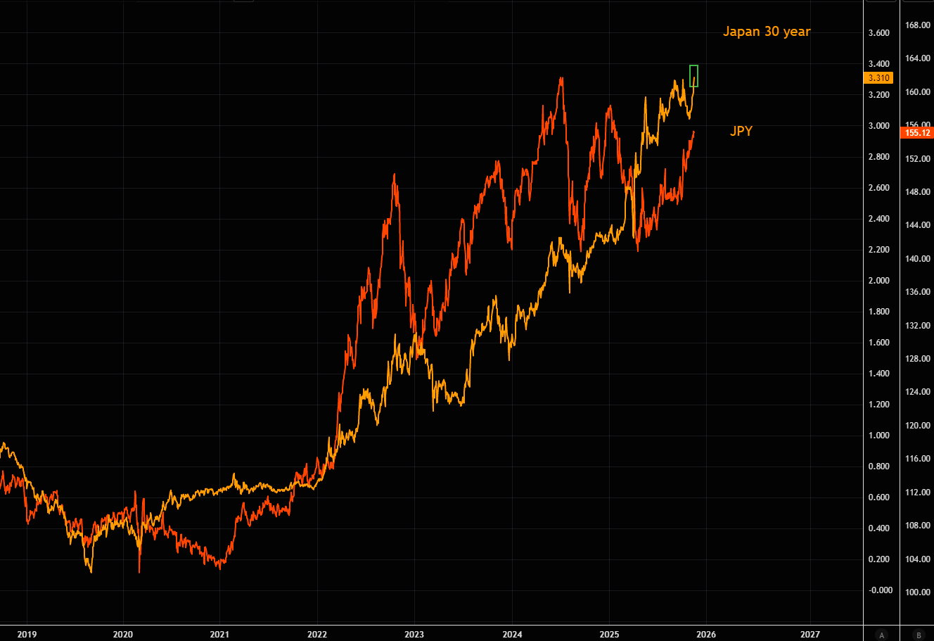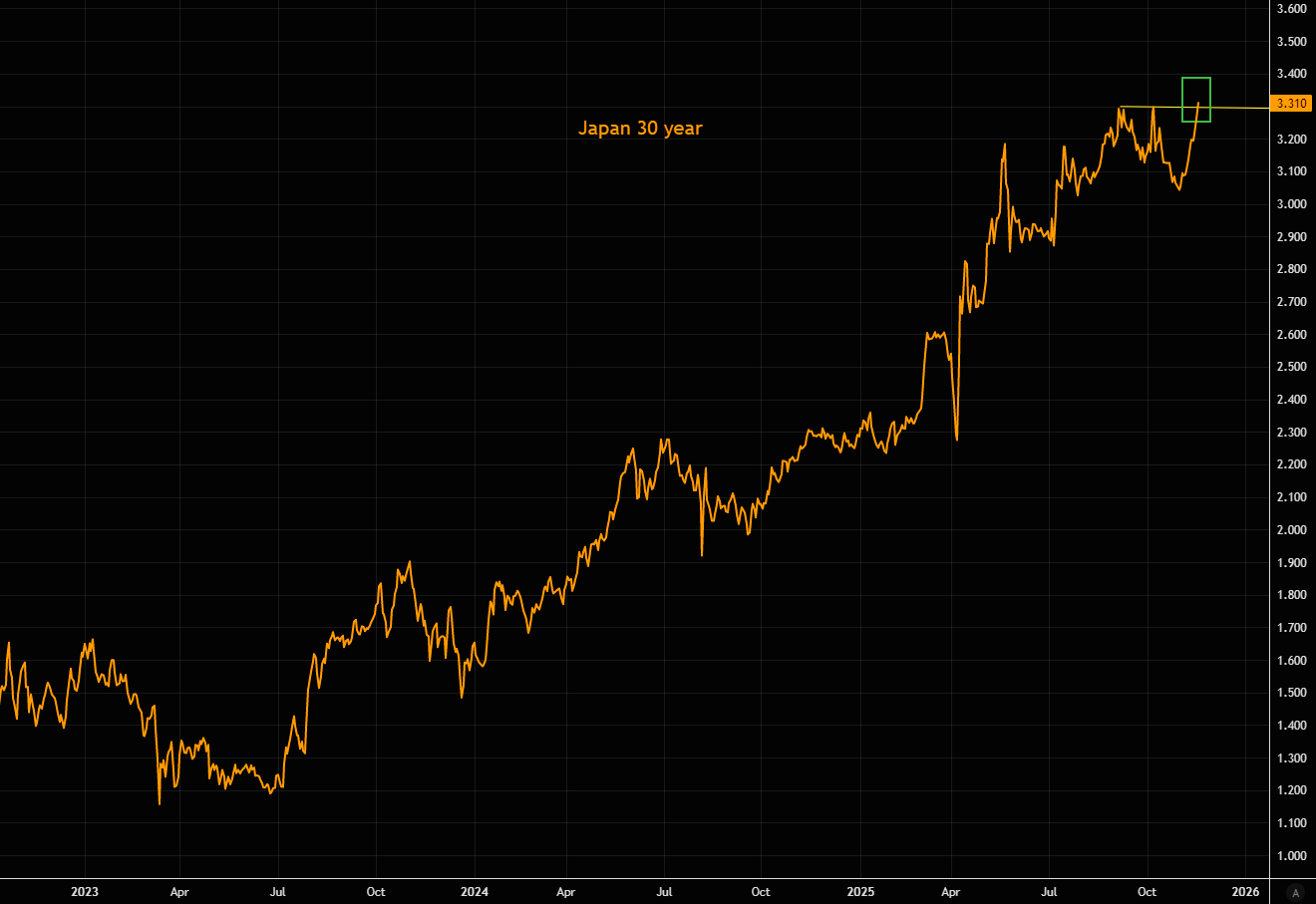 Japanese long bonds keep sliding as markets brace for a bigger-than-expected supplementary budget from the new Takaichi administration later this week. JPY has continued to weaken as well.